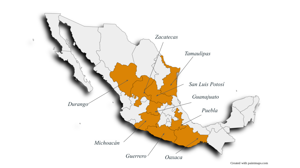 Oaxaca, Guerrero, Michoacán, Guanajuato, San Luis Potosí, Puebla, Zacatecas, Durango and Tamaulipas